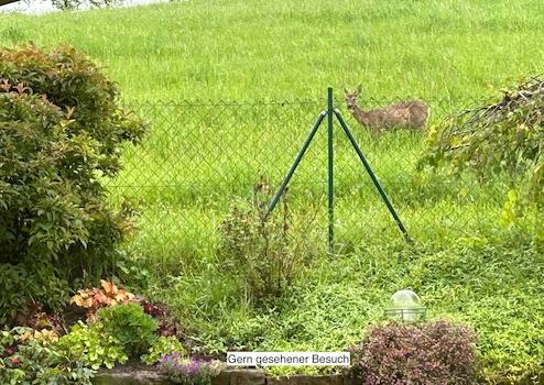 Der weitgehend ebene, komplett eingezäunte Garten mit einem abschließbaren Ausgang auf angrenzende Obstwiesen ist ideal zum Spielen und Feiern, die ebene Rasenfläche wird von einem Rasenroboter gepflegt. Für Gartengeräte und -zubehör steht ein großzügig bemessenes Holz-Gartenhaus zur Verfügung.