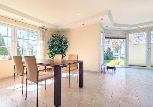 Erdgeschoss: Wohn- und Esszimmer (mit Terrassenzugang), Küche (ebenfalls mit Zugang zur Terrasse), Diele, Gäste-WC, Abstellraum I (mit Garagenzugang), Abstellraum II