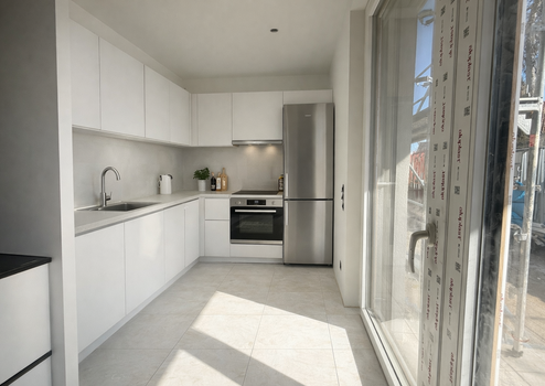 Sie erreichen die Wohnung in der 1.Etage bequem über den Aufzug oder über die Treppe. Über den geräumigen Eingangsbereich, der ausreichend Platz für eine Garderobe bietet, gelangen Sie in das Herzstück der Wohnung: den offenen Wohn- und Essbereich. Dieser überzeugt mit viel Platz für eine große Wohnlandschaft, einen Esstisch sowie einen TV-Bereich. Die offene Raumgestaltung sorgt für ein besonders angenehmes Wohngefühl und macht diesen Bereich zum perfekten Treffpunkt für Familie, Freunde und entspannte Abende zu Hause. Die angrenzende Küche bietet ausreichend Raum für eine großzügige Einbauküche nach Ihren eigenen Vorstellungen, sodass Sie diesen Bereich ganz individuell gestalten können.