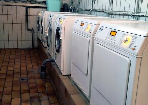 Münzwaschmaschinen und Trockner in Topzustand stehen täglich 24 Stunden in der obersten Etage zur Verfügung (nicht stufenfrei).