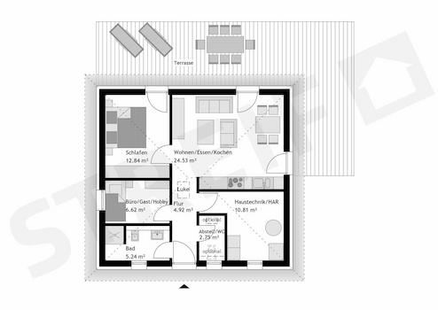 Dieser individuell projektierte Bungalow von STREIF bietet mit seinen 67 m² Wohnfläche und 3 Zimmern ein perfektes Zuhause für Paare oder kleine Familien. Das moderne Haus, das auf einem großzügigen 700 m² Grundstück im Neubaugebiet von Michendorf errichtet wird, überzeugt durch seine funktionale und zugleich elegante Gestaltung auf einer Ebene. Ein Schlafzimmer und ein Badezimmer mit Fenster und Dusche sowie ein zusätzliches Gäste-WC sorgen für hohen Wohnkomfort. Die große Auswahl an Dachformen - vom klassischen Walmdach über das elegante Zeltdach bis hin zum modernen Flachdach im Bauhausstil - ermöglicht es Ihnen, den Bungalow ganz nach Ihren ästhetischen Vorlieben und Bedürfnissen zu gestalten. Dieses Projekt ist speziell nach Ihren Wünschen konzipiert und bietet die ideale Kombination aus Funktionalität, Komfort und individuellem Design, um Ihren Traum vom eigenen Haus Wirklichkeit werden zu lassen.