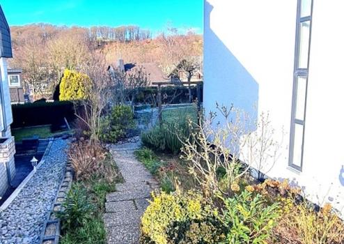 Der Garten verfügt über eine zentrale Rasenfläche, die von Grünflächen entlang der Grundstücksgrenze umgeben ist. Direkt am Haus, sowie im Nord-Osten des Gartens befindet sich jeweils eine große Terrasse, die beiden Wohneinheiten eine gleichzeitige Nutzung des Gartens ermöglichen.