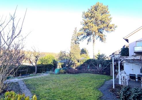 Dieses wohlproportionierte Zweifamilienhaus mit quadratischer Grundfläche verfügt über eine geschossübergreifende 5-Zimmer-Wohnung (160 m²) im Erdgeschoss und Gartengeschoss, sowie eine Zweizimmer-Wohnung (64 m²) im Obergeschoss. Das 1980 fertiggestellte Haus steht auf einem Erbpachtgrundstück mit einer Fläche von 645 m², dessen Erbbaurecht bis 2071 rechtswirksam ist. Im Erdgeschoss befindet sich mit der offenen Küche mit fließendem Übergang zum Ess- und Wohnbereich und dem zentralen Holzkamin das tagesaktive Herzstück der Wohnung mit Panoramablick auf den großzügigen Garten mit Obstbäumen und Weinreben. Der Arbeits- und Gästeraum im Erdgeschoss, der auch als Kinderzimmer genutzt werden kann, sowie das Gäste-WC im Eingangsbereich, bieten einen zusätzlichen Komfort.