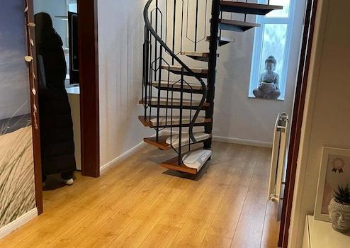 Über eine Wendeltreppe erreicht man das Gartengeschoss, wo sich der Rückzugsbereich mit drei Zimmern und ein großzügiges Tageslichtbad mit Badewanne und Dusche befindet. Die leichte Hanglage wird also optimal genutzt und bietet auch Abstellmöglichkeiten in zwei separaten Kellerräumen. Der Heizungskeller verfügt über Aufstellflächen für Waschmaschinen, Wäschetrockner und Wäscheständer.