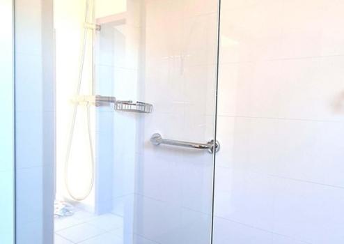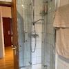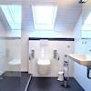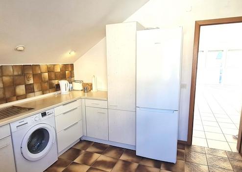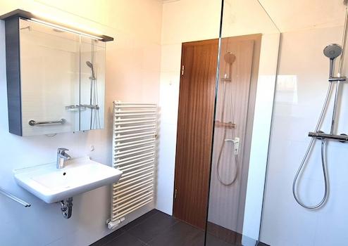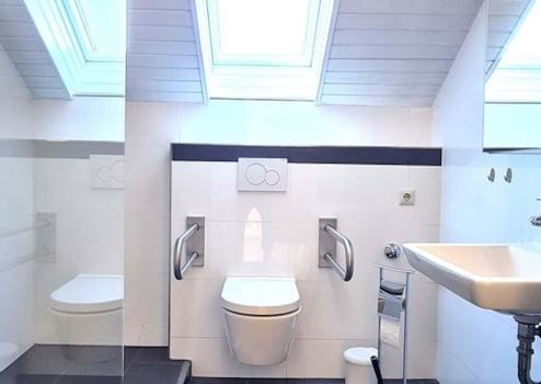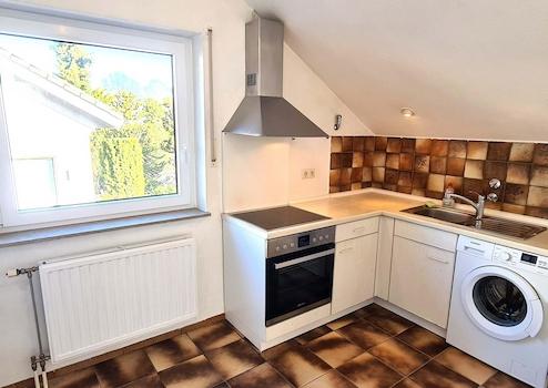 Die eigenständige Wohnung im Obergeschoss bietet ebenfalls einen großzügigen, nach Westen orientierten Wohn-Ess-Raum mit bodentiefen Fenstern und ein Tageslichtbad mit Walk-In-Dusche. Die Küche und der Schlafraum sind hingegen nach Osten orientiert und bieten ausreichend Platz für einen Zweipersonenhaushalt. Ein Abstellraum neben der Küche und ein Putzmittelraum neben dem Bad sind sehr funktional positioniert. Weitere großzügige Stauflächen befinden sich in den Drempeln und im Dachboden, der über eine ausklappbare Dachbodenleiter erschlossen ist.