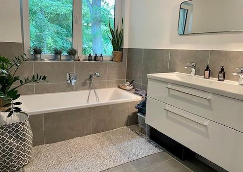 - große, hellgraue Badfließen