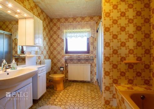 Die Bäder sind aus den 70'er und 80'er Jahren. Sie sind mit farbigen Wandfliesen raumhoch gefliest und sind mit gut erhaltenen Sanitärobjekten ausgestattet.