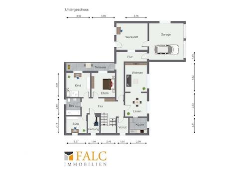 Im Untergeschoss bzw. Souterrain des Wohnhauses befindet sich neben der Einliegerwohnung eine besonders hervorzuhebende Nutzfläche, die gezielt auf die Bedürfnisse von Handwerkern, Selbständigen oder Familien mit hohem Platzbedarf zugeschnitten ist.