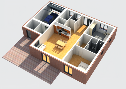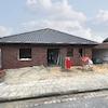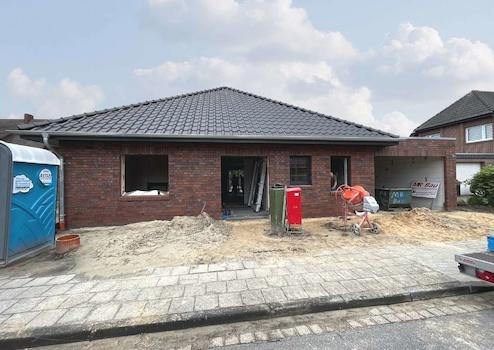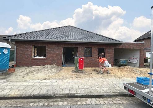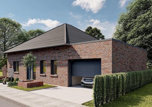 Der Walmdachbungalow wird auf einem Lückengrundstück schlüsselfertig erstellt.