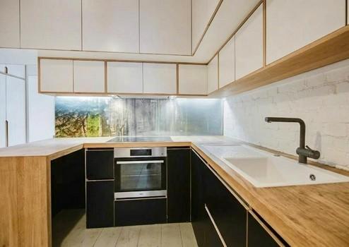 Dunkel geölte Holzdielen, Design Einbauküche als Raumteiler und Schrankwand, Badewanne, sehr gute Einbaugeräte, wie Wachmaschine, Geschirrspüler, Herd&Ofen, Abstellkammer, extrem viel Stauraum in Hochschränken, Möblierung & Inventar sind durchdacht und qualitativ hochwertig.