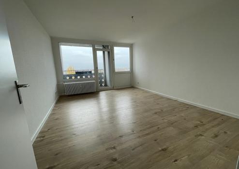Das Highlight ist das außergewöhnlich helle Wohn-/Schlafzimmer: Durch die große Fensterfront wirkt der Raum offen, freundlich und modern. Der Balkon/Loggia erweitert den Wohnbereich und bietet einen schönen Ausblick). Der Boden in Holzoptik und die weißen Wände unterstreichen den zeitgemäßen, aufgeräumten Eindruck.