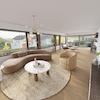 Das 45 qm große Wohnzimmer ist mit 2 Seiten tiefgezogenen Fensterfront lichtdurchflutet und öffnet über die Schiebetür den direkten Zugang zum Garten.