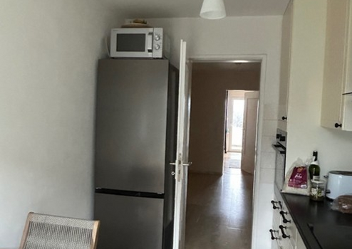 The available room number 3 is fully furnished and has a comfortable 1.40 m wide bed with mattress and duvet cover, a desk with chair, a ceiling lamp, and a wardrobe. The room has direct access to the balcony. The previous tenant is moving out at the end of April, so the room will be available from May.