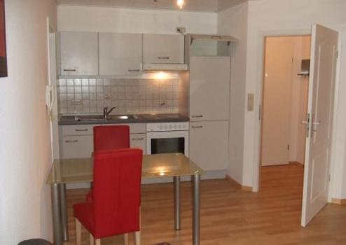 Wohn- und Eßzimmer mit kompletter Küchenzeile (Ceran-Kochfeld, Laminat), Tageslichtbad mit Badewanne und separater Dusche (Fliesen), Schlafzimmer (Laminat), Terrasse (von beiden Zimmern zugänglich), Kellerabteil. Fast voll und hochwertig möbliert, neuwertige Möbel, Elektrogeräte etc. Wohn-/Esszimmermöblierung aus Naturholz (mit Innenbeleuchtung),