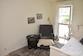 Wohn/Schlafzimmer mit Bett 90x200 cm, Schreibtisch, Stuhl, Kleiderschrank, Teppich, Parkett.