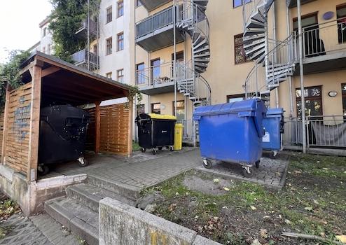 Die Außenanlage umfasst einen gepflasterten Innenhof mit Zugang zum Seitenhaus sowie einen Müllplatz. Der Innenhof bietet eine gepflegte und aufgeräumte Umgebung und erleichtert den Zugang zu weiteren Bereichen des Hauses.