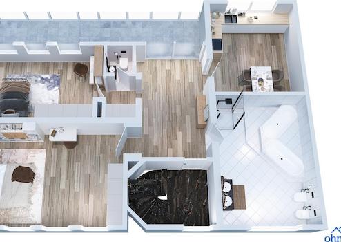 - Drei Tageslichtbäder, davon zwei Vollbäder; mittleres Bad mit Fußbodenheizung