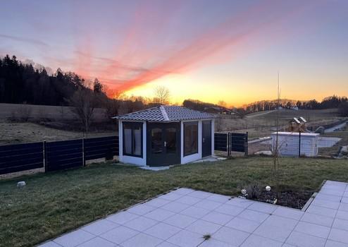 Der große Südgarten mit Waldblick lädt zum Entspannen ein. Zwei großzügige Terrassen und ein hochwertiges Gartenhaus bieten weitere Rückzugsorte für gesellige Stunden im Freien. Das Gartenhaus ist bereits für eine Sauna vorbereitet – Starkstromanschluss vorhanden!