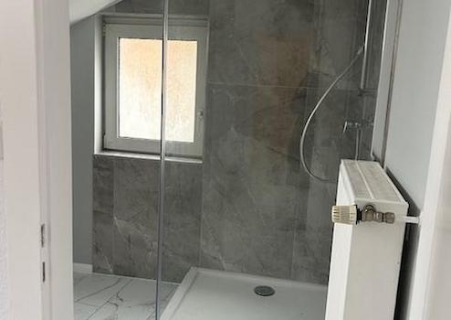 Das neu gestaltete Badezimmer präsentiert sich in modernem Design: Eine großzügige Dusche und ein separates Gäste-WC erhöht den Wohnkomfort. In den Wohnräumen ist ein hochwertiger Vinylboden in warmem Holzdesign verlegt, der eine behagliche Atmosphäre schafft. Fliesen in Marmoroptik verleihen dem Bad eine elegante, zeitlose Note und sind zugleich pflegeleicht.