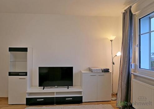 ### Please note the availability date! Bitte das Verfügbarkeitsdatum beachten! ### möblierte 1-Zimmer-Wohnung mit WLAN in Arnstadt; Wohnraum mit Bett, Kleiderschrank, Schreibtisch, Schrankwand und TV; Wohnküche mit ...