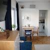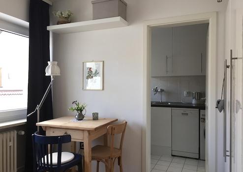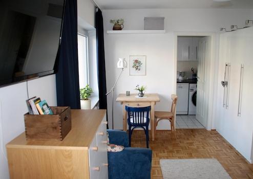 Das Apartment ist voll möbliert und ausgestattet, mit TV, Kommunikation, Haushaltsgeräten, Geschirr, Besteck, Bettwäsche und Accessoires.