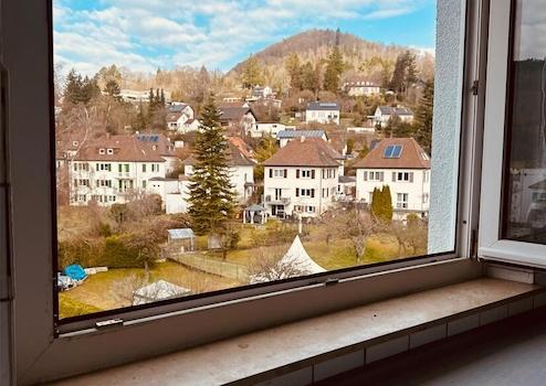 Schöne Ausblicke ins Grüne sowie über die Stadt verleihen den Räumen eine besonders angenehme Wohnatmosphäre. Das großzügige Wohn- und Esszimmer mit über 25 qm; bildet das Herzstück der Wohnung und bietet direkten Zugang zur Loggia.
