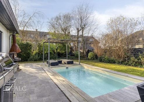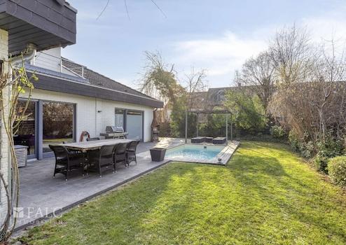 Der liebevoll gestaltete Garten mit großzügiger Terrasse, beheiztem Pool und einer stilvollen Lounge-Area mit gemütlichen Liegen schafft eine Oase der Entspannung. Hier genießen Sie Ruhe, Atmosphäre und echtes Urlaubsgefühl im eigenen Zuhause.