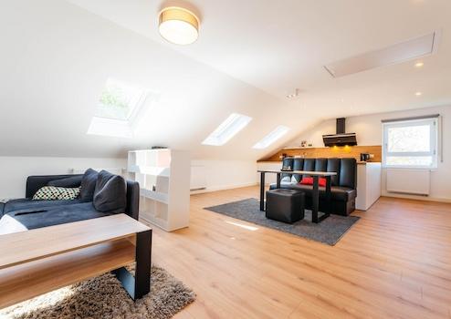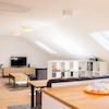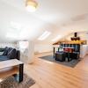 Die Wohnung verfügt über einen großen Wohn-/Essbereich welcher durch viele große Fenster sehr helles Ambiente bietet. Der große offene Bereich verfügt zusätzlich über eine Couch einen Sessel und ein Regal bzw. einer Kommode, sodass man sich hier sofort wohlfühlen kann.