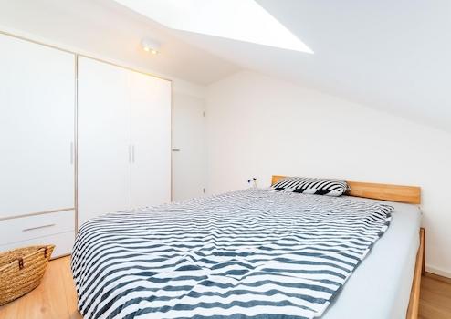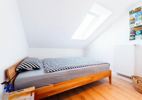 Ein komfortables Bett sowie ein geräumiger Schrank sorgen für erholsamen Schlaf und ausreichend Stauraum.