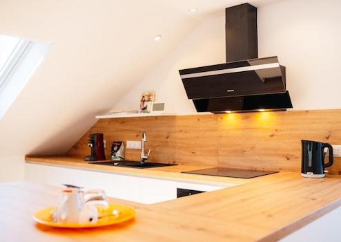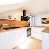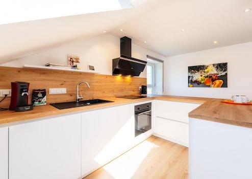 Die voll ausgestattete Küche lässt keine Wünsche offen und ist mit hochwertigen Elektrogeräten, Pfannen, Töpfen, Geschirr und etlichem Zubehör eingerichtet
