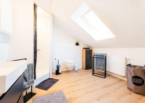 Das Bad verfügt über eine begehbare Dusche, ein WC und einen großen belichteten Spiegel über dem Waschbecken.
