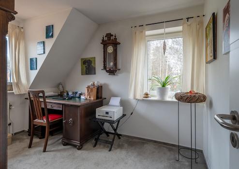 Das Reihenendhaus (rechtlich als Wohnungseigentum geführt) wurde 1985 erbaut. Zum Miteigentumsanteil gehören 2/3 der Grundstücksfläche von 371 m² sowie das Sondereigentum an der ca. 110 m² großen Wohnung, die sich über 2 Etagen plus Spitzboden erstreckt. Im EG befinden sich ein Abstellraum mit Gäste-WC, die Küche, der große Wohnraum mit Kaminofen (Bj. 2010) und der große, beheizte Wintergarten mit Blick ins Grüne und Zugang zur überdachten Terrasse sowie in den Garten. Die Treppe im Eingangsbereich führt ins Obergeschoss. Hier präsentieren sich die beiden gut ausgestatteten Bäder (eines mit Dusche, eines mit Badewanne), 3 weitere Zimmer (Schlafen, Kinder, Arbeiten, Gäste...) und zwei Abstellräume. Mit der Klapptreppe im DG-Flur erreicht man den Spitzboden (nicht ausgebaut). Im Gartenbereich gibt es außerdem noch ein kleines Gartenhaus, zudem gehört zum Objekt eine Pkw-Garage. Die Immobilie wird über eine moderne Gasbrennwert-Therme (Bj. 2018) mit Wärme und Warmwasser versorgt.