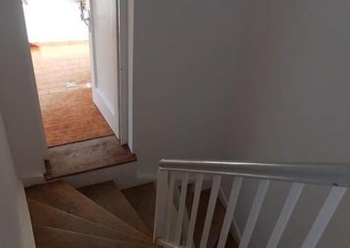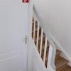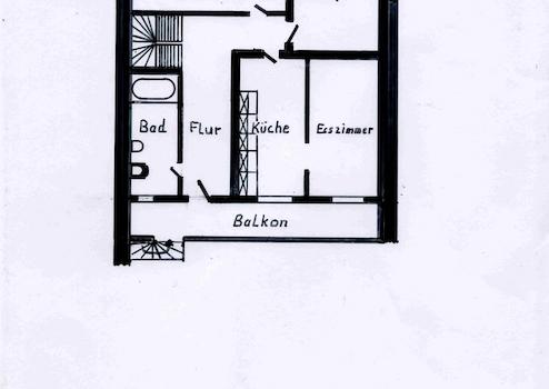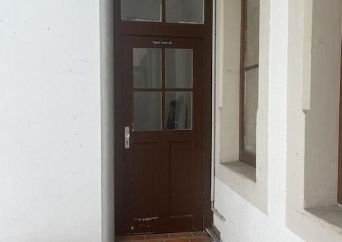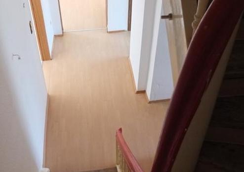 Die Wohnung hat einen eigenen Zugang von einer eigenen Haustür aus und liegt im 1. und 2. Obergeschß des Hauses. Die Treppe zur Wohnung genau wie die Treppe in der Wohnung, beide mit Holzgeländer, wurde von Belägen befreit, das Holz abgeschliffen und lackiert und beide strahlen nun wieder als originale Holztreppen.