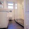 Das Badezimmer weist ein Tageslichtfenster auf und ist mit einem Handtuchheizkörper sowie einer großen, begehbaren Dusche ausgestattet.