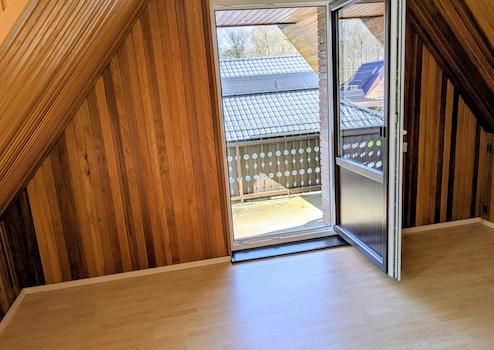 Im OG befinden sich vier Zimmer, ein kl. Bad, eine Dachterrasse (Süd) und eine geschützte Loggia (West).