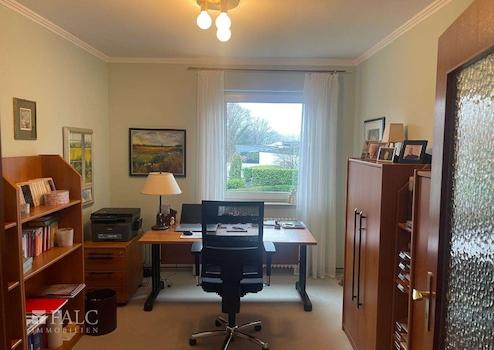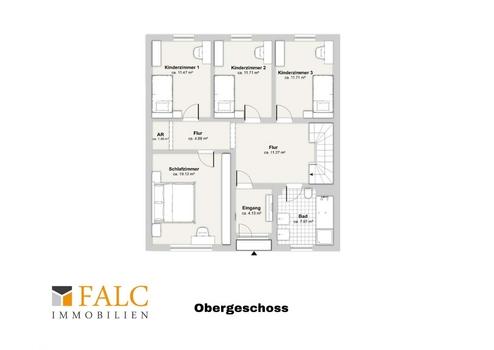Von hier aus gelangen Sie über einen Vorflur zur großzügigen Diele, die in alle Räume führt. Diese Etage umfasst insgesamt drei Arbeits- bzw. Kinderzimmer, ein geräumiges Schlafzimmer sowie ein modernisiertes Masterbad. Somit bietet das Obergeschoss ausreichend Platz für Familie, Homeoffice oder Gäste.