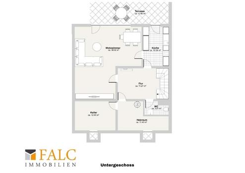 Das Untergeschoss erreichen Sie über eine Treppe, die sich direkt an die Diele anschließt. Der großzügige und offene Wohn-/Essbereich lädt zum Verweilen ein. Die bodentiefen Fenster ermöglichen einen direkten Zugang zum Garten. Weiterhin befindet sich hier die Küche und das Gäste WC. Keller und Heizraum befinden sich ebenfalls auf dieser Ebene.