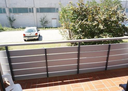 Der Balkon hat eine schöne Größe und bietet genügend Platz für einen Tisch mit Stühlen.