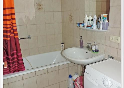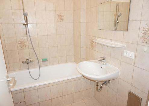 Das Bad ist hell gefliest und mit einer Badewanne und einem Waschmaschinenanschluss ausgestattet.