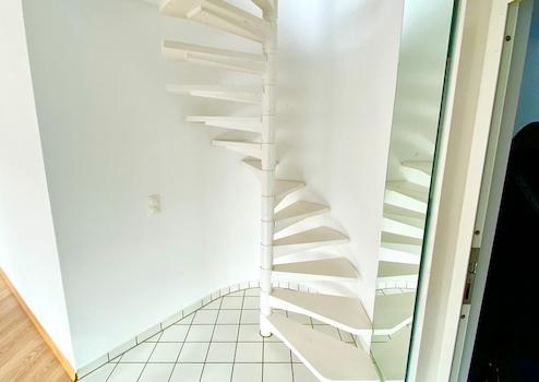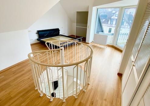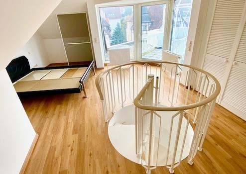 Modern und Lichtdurchflutet präsentiert sich diese Wohnung auf zwei Ebenen mit einer Wohnfläche von ca. 110 m², die sich auf 1 Zimmer pro Etage verteilt. In der 3. Etage befinden sich neben dem großen Wohnraum die Einbauküche und zwei Balkone. In der 4. Etage erreichen Sie über die Wendeltreppe das Schlafzimmer, das sehr große Badezimmer und die Dachterrasse mit Sparrenburgblick. Das Schlafzimmer verfügt bereits über Einbauschränke.