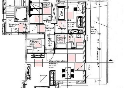 Die Wohnfläche beträgt 105m² (Innenbereich 96m² zzgl. Dachterrasse zu 25% gem. WoFlV).