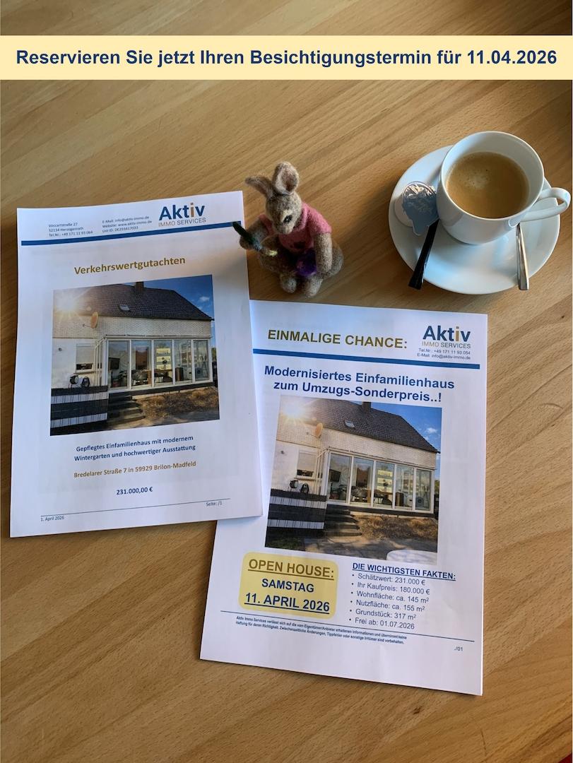 Der Weg zu Ihrer Traumimmobilie: * Anfrage: Senden Sie uns eine Nachricht, E-Mail, WhatsApp oder rufen Sie uns an. * Unterlagen: Sie erhalten umgehend das detaillierte Gutachten sowie das Exposé per E-Mail. * Besichtigung: Nach Durchsicht der Unterlagen vereinbaren wir Ihren persönlichen Termin im Rahmen unseres Open-House-Tages.