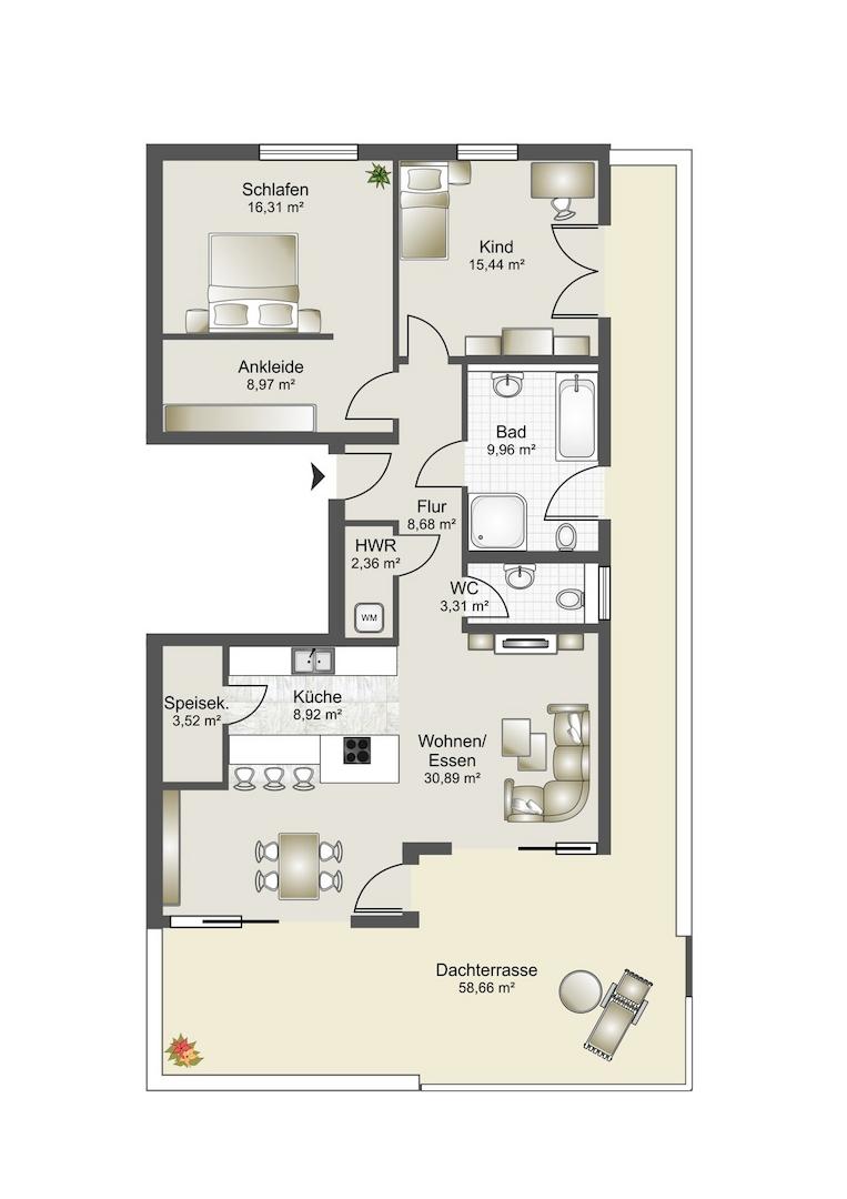 Attraktive 3,5-Zimmer-Dachgeschosswohnung mit großzügigem Grundriss und Dachterrasse