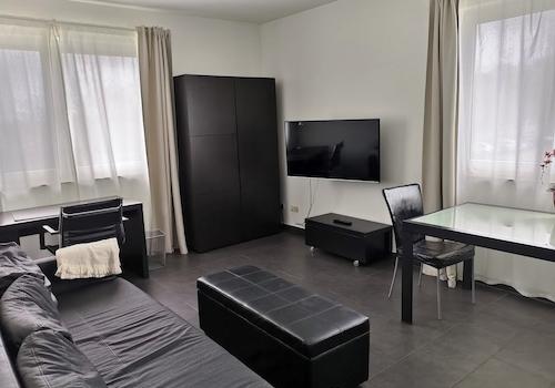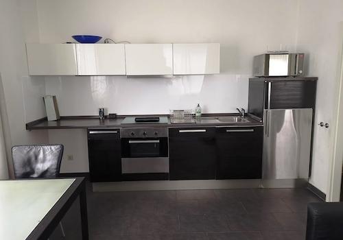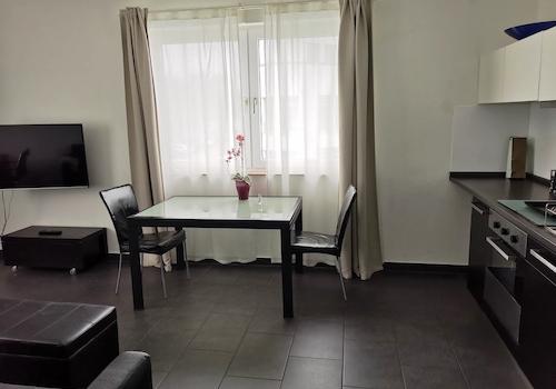 möbliert. Terrassen-Apartment mit Wohnküche. TH+FH+Flughafen+Zentrum gut erreichbar.