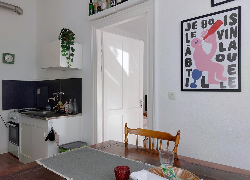 Wohnung rückwärtig, ca. 23 m² Wohnfläche: 1 Zimmer mit Dusche, Wohnküche, zugehöriges WC extern an der Wohnung
